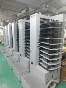・1台の丁合機に10段の棚があります。そこへA5+外トンボサイズの用紙をセットします(2頁×10段=20頁分)。